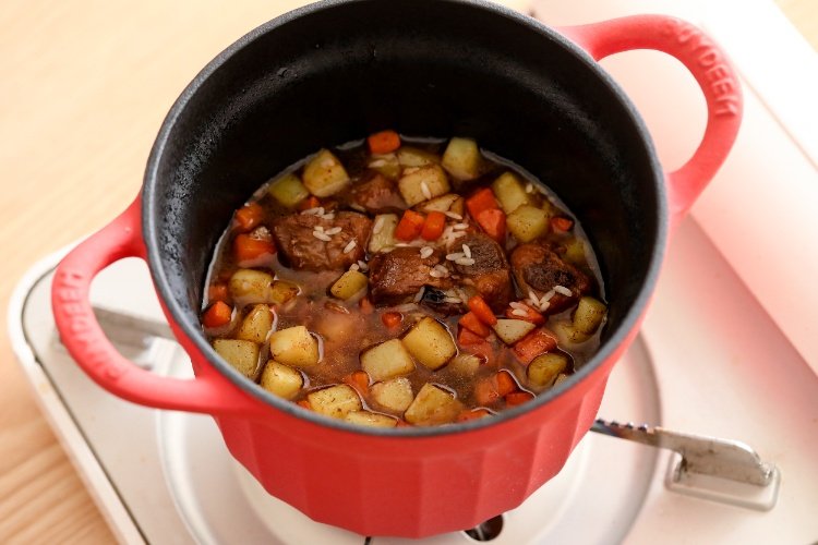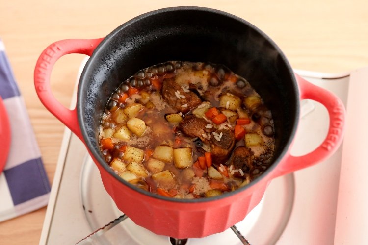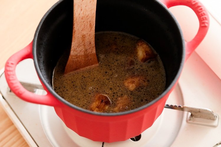 待用的汤汁加入小圆锅中,加至锅中汤汁量距离食材表面还有0.5cm的地方(如果汤汁不够可以加点水);