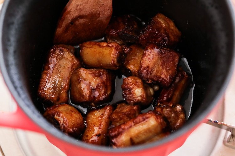 再加入老抽、生抽、蚝油、细砂糖翻炒上色;