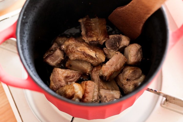 加水稍微没过排骨,中火开盖烧开,转小火加盖炖煮18分钟;