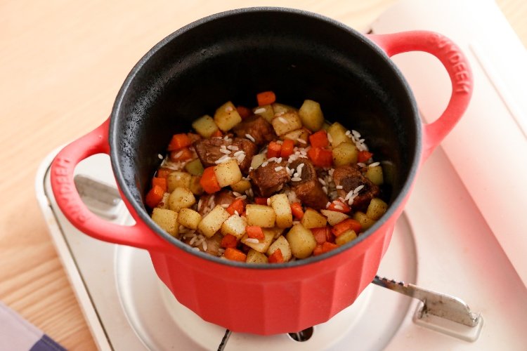 排骨炖好后若汤汁还有很多,先盛出一部分汤汁待用,留小量在小圆锅内,放入大米和排骨轻轻拌匀后再加入土豆和胡萝卜拌匀;