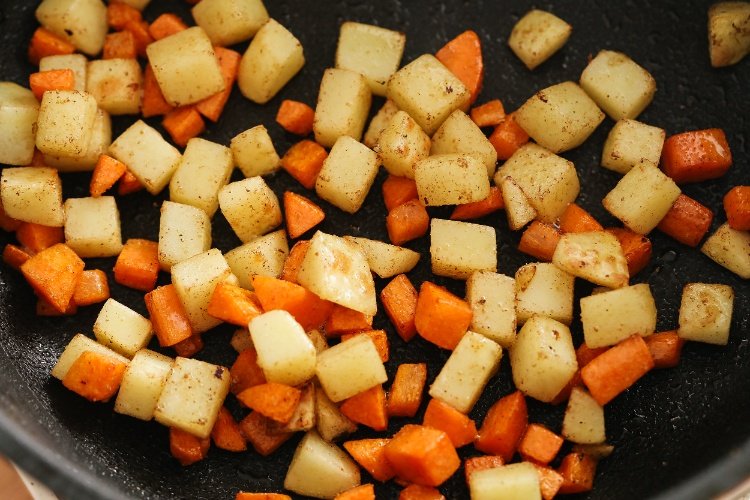 炖的时候把土豆和胡萝卜切小块,用炒锅炒到微微焦黄后,放入盐和孜然粉翻炒均匀,盛出备用;