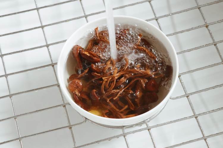 茶树菇用清水泡20分钟,在泡的过程中清洗2-3次。