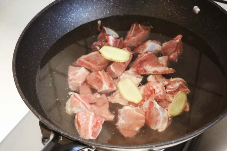 一小块姜切成五片,在茶树菇浸泡的时候,来清洗排骨,用清水冲洗两次,然后冷水下锅,放三片姜,烧开后再煮五分钟。