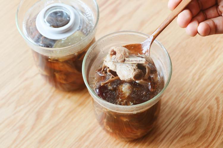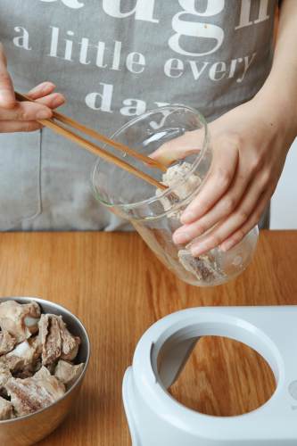 两个小时后取出炖盅只需要加适量的盐就可以喝了,完全不需要多余的调料,加盐排骨汤已经非常鲜了。