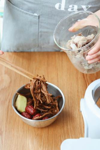 再加入泡好的茶树菇,红枣,姜片放入炖盅。