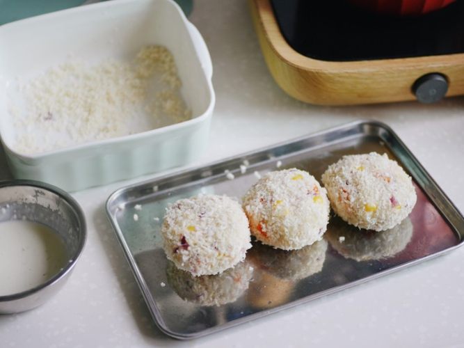 把薯饼在面糊里滚一圈,再粘满面包糠