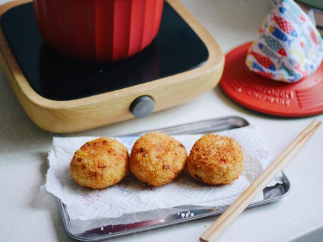 把以上步骤的食材混合,加入沙拉酱和胡椒盐调味,混合均匀之后分成三块薯饼,稍微整形一下~