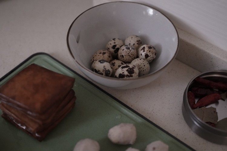 香干鸡翅根切花刀备用,鹌鹑蛋煮熟剥壳