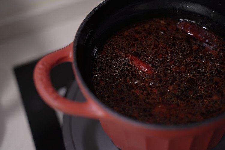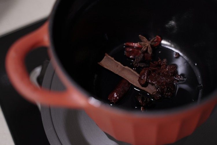 锅里加油,把香料(八角、香叶、桂皮、干辣椒))和豆瓣酱炒香至出红油