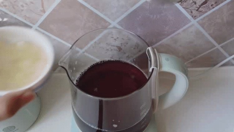 拿开小蒸笼,葡萄汁趁热加入冰糖,用勺子稍微搅拌一下,等待放凉就可以喝了