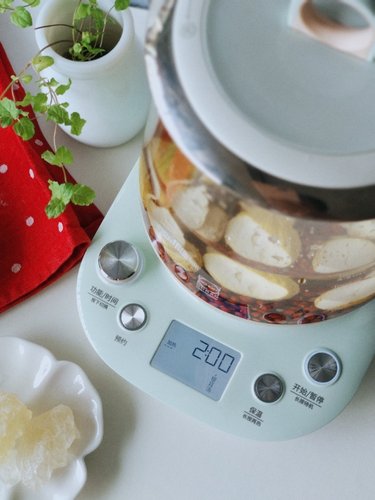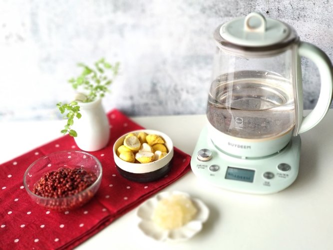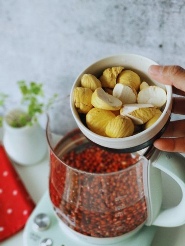 将红豆、板栗仁放进养生壶里,加入适量的清水