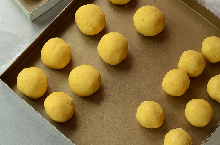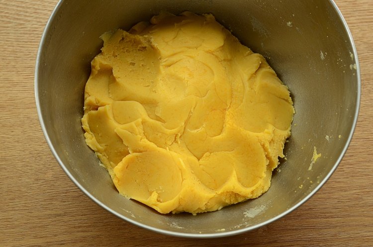 把炒好的栗子馅儿和过筛好的咸蛋黄混合,就是我们的金沙栗子啦。