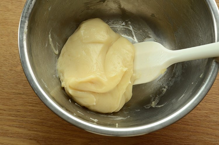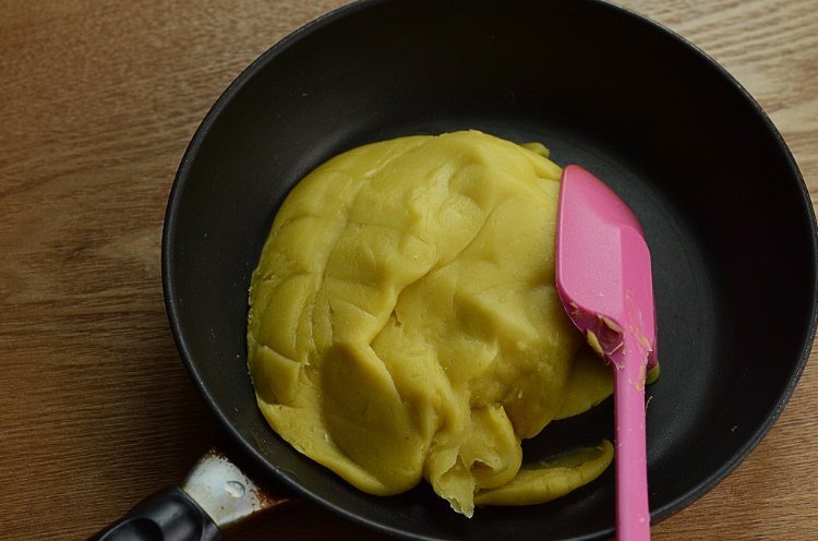 栗子泥倒入平底锅翻炒,可以分次加入糖,炒得差不多了,分次加入黄油。大家炒的时候可以尝一尝,根据自己口味增减糖量,但是我觉得这个已经不甜不油了,可以再多点糖多点油,因为酥皮是没有什么味道的。