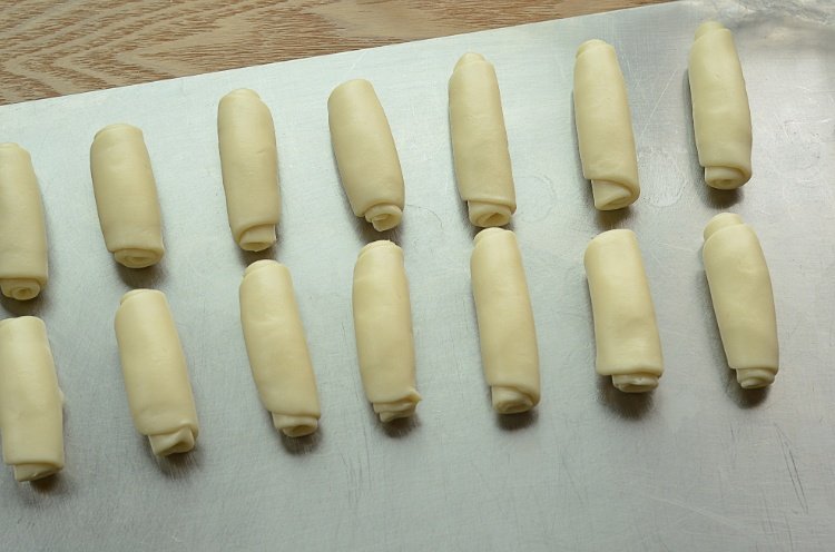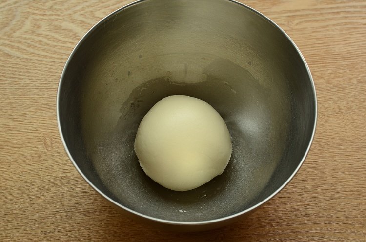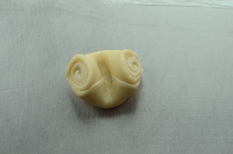 松弛结束,将面皮中间压一道,然后两头向中间整理。