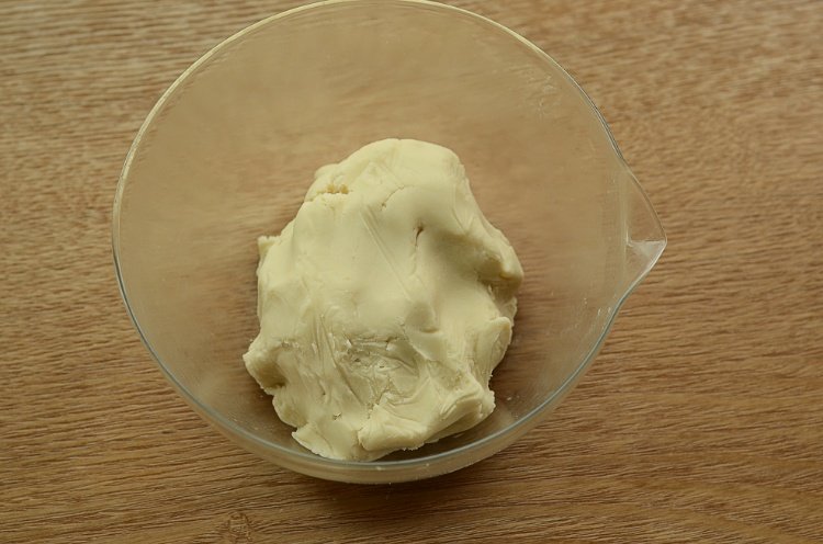揉油皮时候,我们自己带上手套,混合油酥。油酥是一个没有筋度的面团。混匀成团就可以了。把油皮和油酥盖上保鲜膜一起松弛半小时。