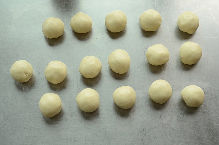 把蒸好的麻薯取出来,趁热拌入黄油,我带着手套趁热揉进去的,确实用刮刀不太好拌。然后就可以揪10g一个,备用了。能揪16个的。