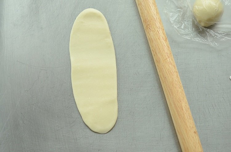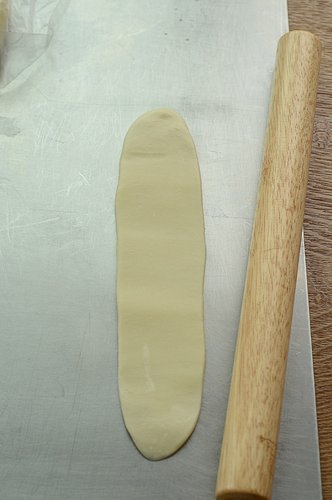 三次松弛,15分钟。松弛结束,继续将面皮擀成长长的牛舌状。