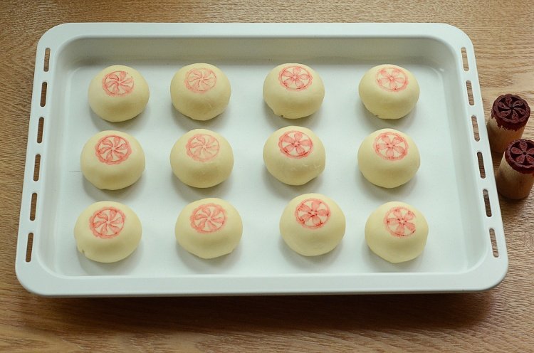 印章蘸取红色色素,我是用红丝绒色素加水调成想要的颜色的,大家也可以用红色色素加水调。把包好的酥皮点心稍微摁压平整一点,盖上印章。