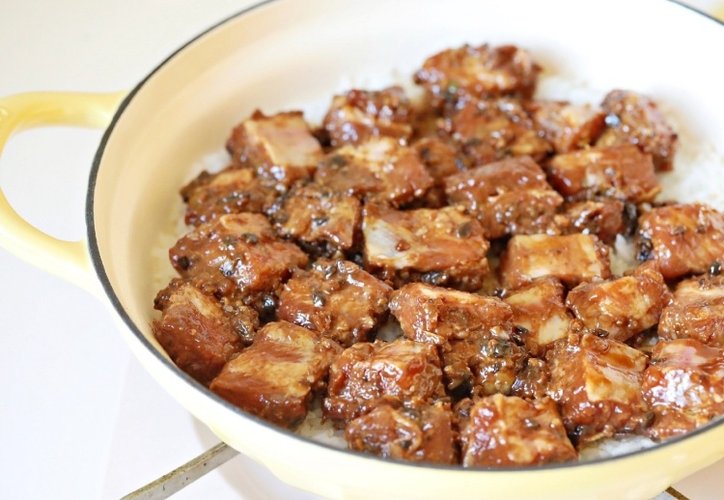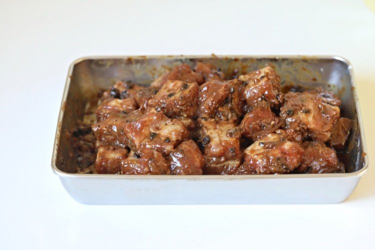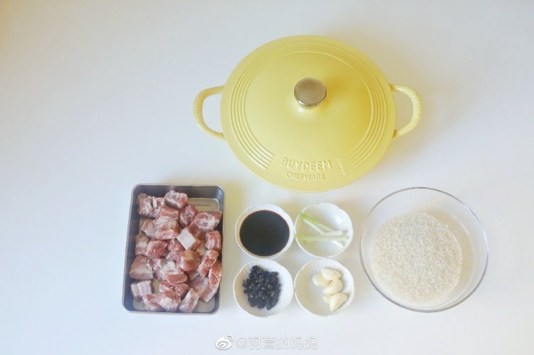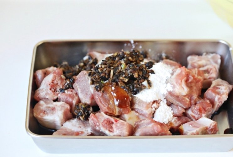 洗净控好水的排骨加入生抽、蚝油、老抽、白胡椒粉、糖、淀粉,姜蒜豆豉末抓匀腌制30分钟。