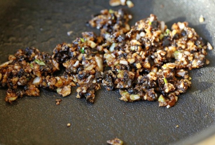葱蒜切成末,豆豉也切碎,锅里倒一点点油加入葱蒜豆豉炒香。