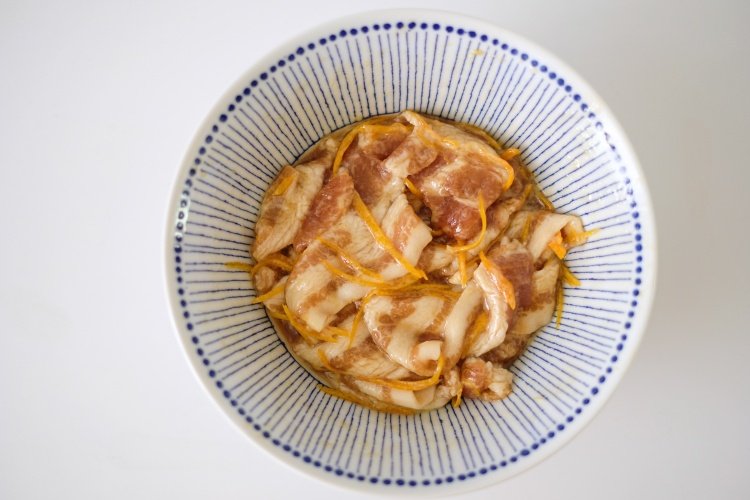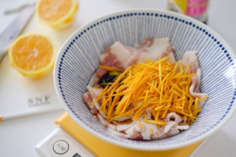 1.五花肉洗净用厨房纸吸干水分,橙子果肉挤出橙汁,剥下的橙子皮切丝,大蒜捣泥;