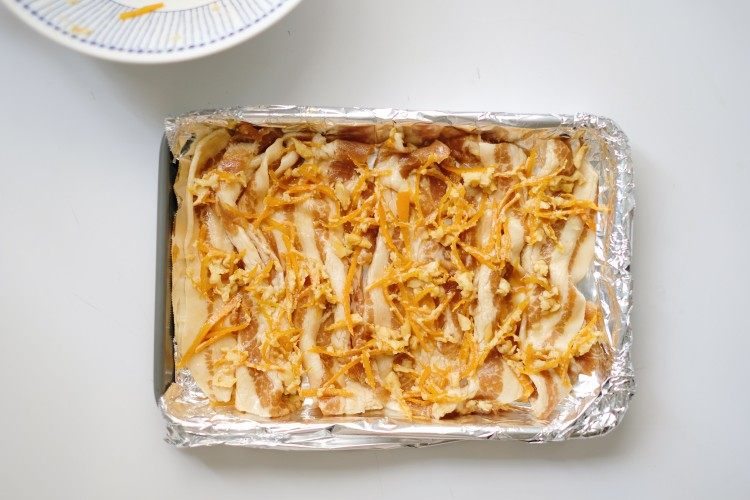 3.烤盘垫锡纸,将腌制好的五花肉均匀平铺在烤盘上;