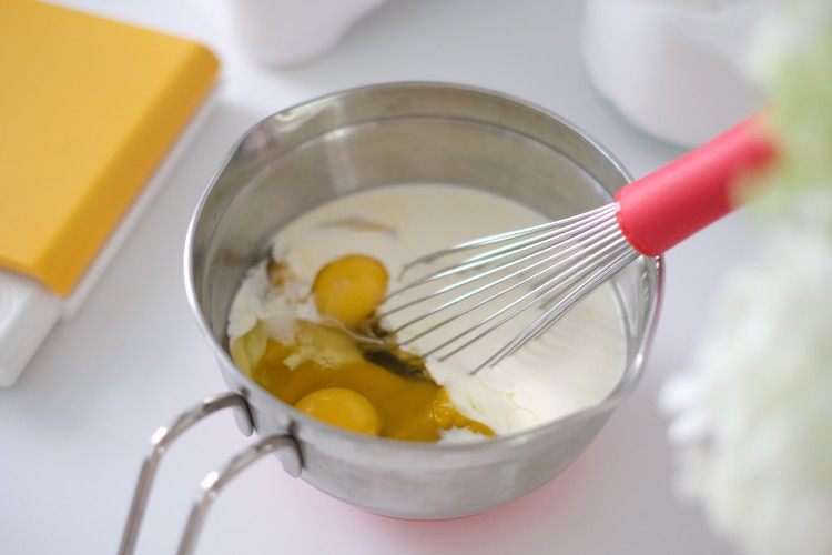 倒入料理盆,加入淡奶油、鸡蛋搅拌均匀;