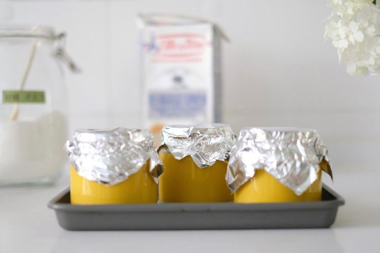 倒入分装杯,杯口裹上锡纸,放入烤盘,烤盘倒半盘热水;