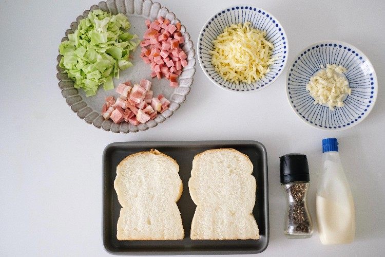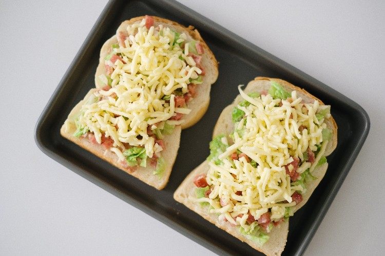 将沙拉平铺在吐司片上,撒上马苏里拉奶酪;