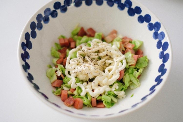 锅热放入培根炒出油,放入火腿炒香,再放入包菜,加少量盐,适当翻炒后盛入碗中;