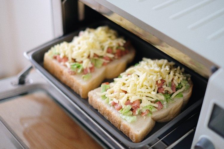 烤箱选择吐司片功能,时间设3-5分钟左右,将铺着食材的吐司片放在烤盘上,入烤箱上层,开始烘烤。