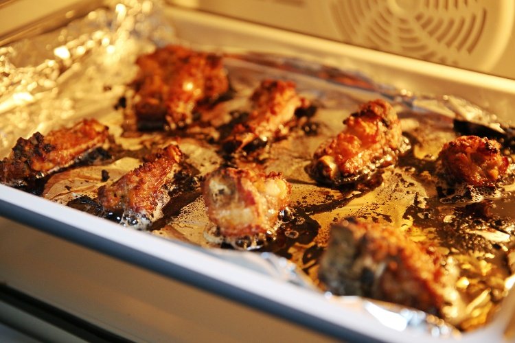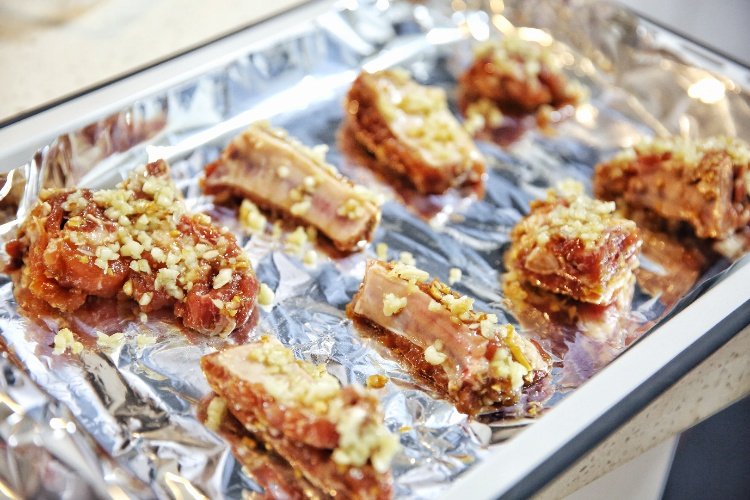 烤盘上摆好锡纸,腌制好的排骨依次摆好,把炒好的蒜蓉均匀撒在排骨上;