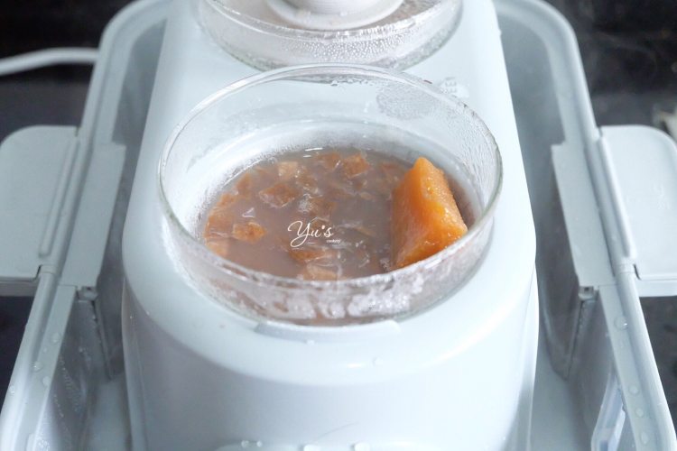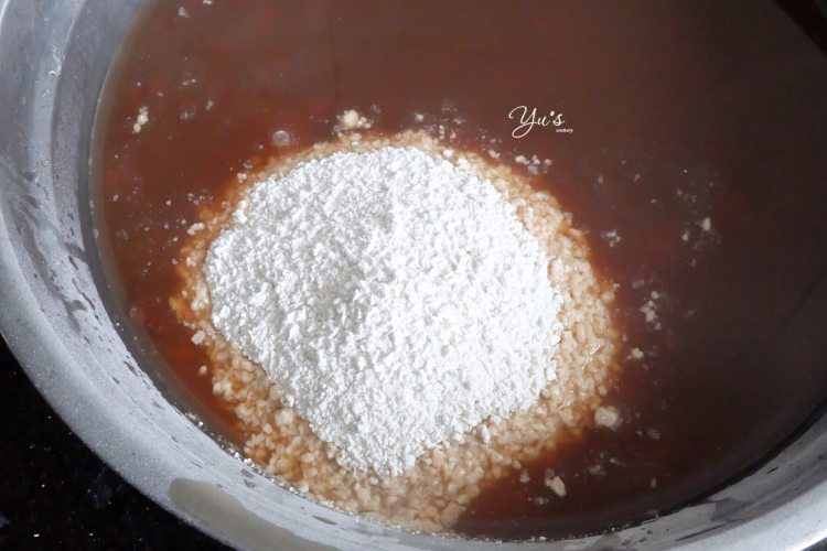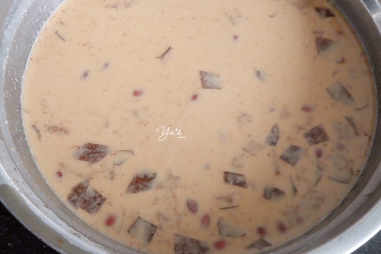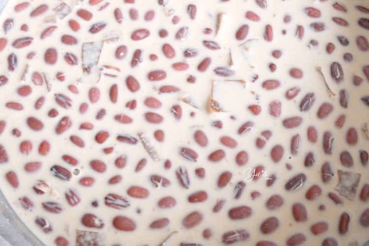 2小时后,放进切小块的片糖,不一开始放片糖,是怕红豆很难熟。喜欢更甜一点的,可以自行增加糖用量。