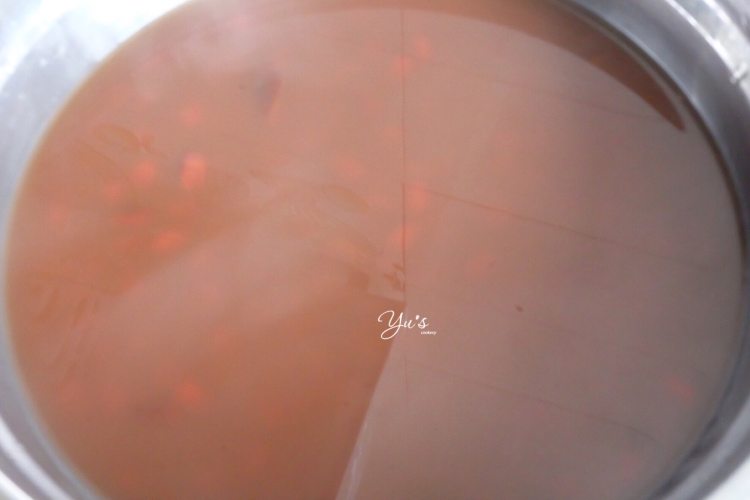 炖好的红豆汤,陈皮味儿香气扑鼻,不喜欢陈皮味儿的也可以不放。把炖好的红豆汤倒出。