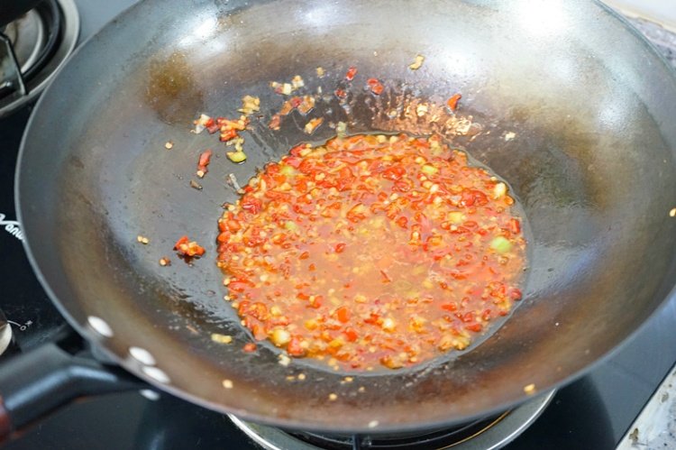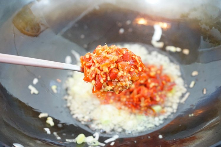 小火爆香大蒜、生姜沫,加入2大勺剁椒酱
