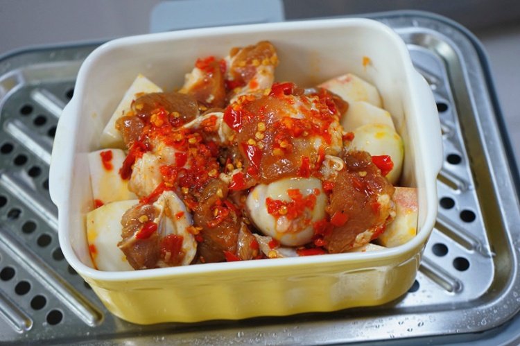 芋头垫到碗底,排骨放在上面,碗底剩余的剁椒酱料汁也一起倒在上面