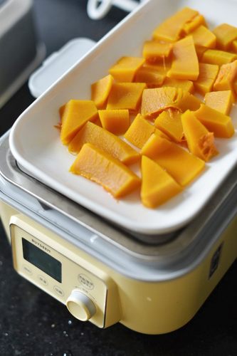 南瓜蒸熟后和牛奶、砂糖打成泥,与淡奶油、鸡蛋一起搅匀,过筛2次。