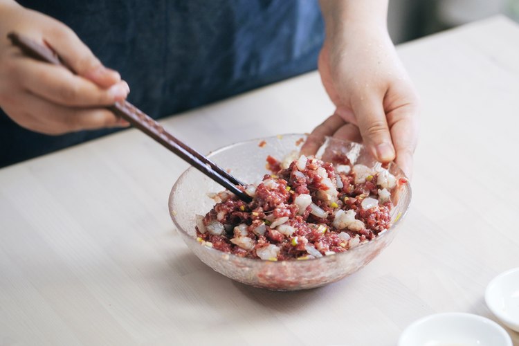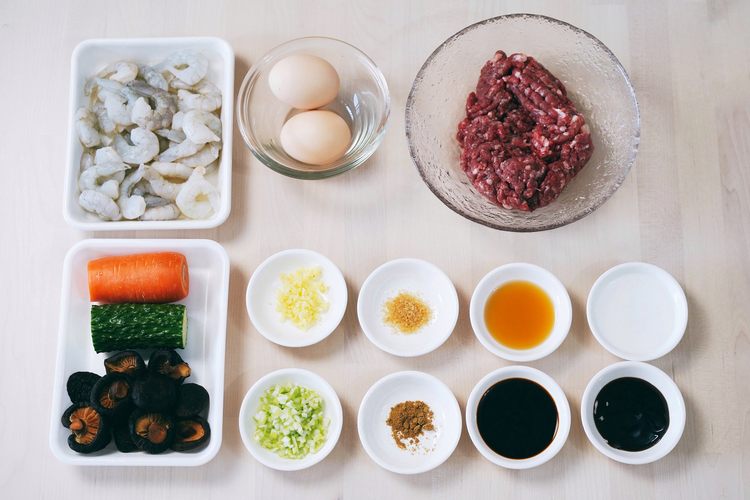 牛肉馅依次加入葱姜末和其他调味料搅拌均匀,之后加入虾仁拌匀成馅料。