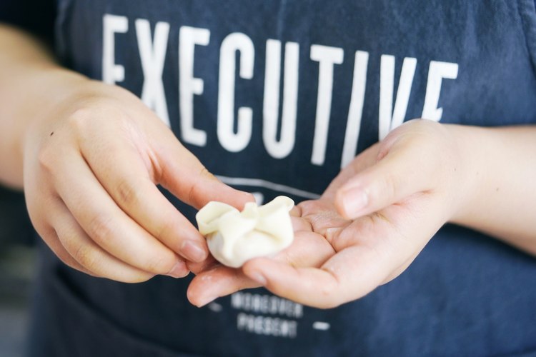 饺子皮上放入少许馅料,对折两边,四角撑开。