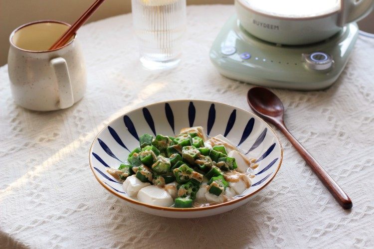 秋葵口感脆嫩,香味独特,一般用来凉拌居多。这道秋葵拌豆腐,只用简简单单的芝麻沙拉酱来拌,口感清新淡雅,可用作大鱼大肉之后的轻断食食谱来食用。