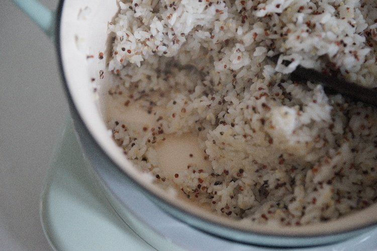 稻米和藜麦用清水洗净,放入珐琅锅中,加入1:1的水,选择煲仔饭功能,选择适中口感,开始烹饪