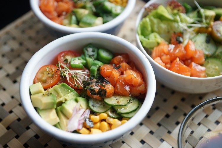 秋葵选择80度温泉蛋功能,煮5分钟,切片,将黄瓜切片、樱桃番茄对开、牛油果去皮去核切块,三文鱼生切块,加入寿司酱油、青芥末和芝麻拌匀,备用