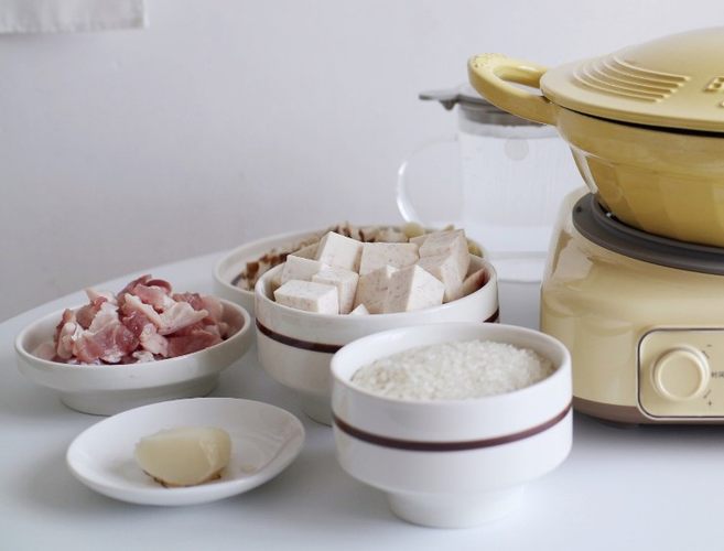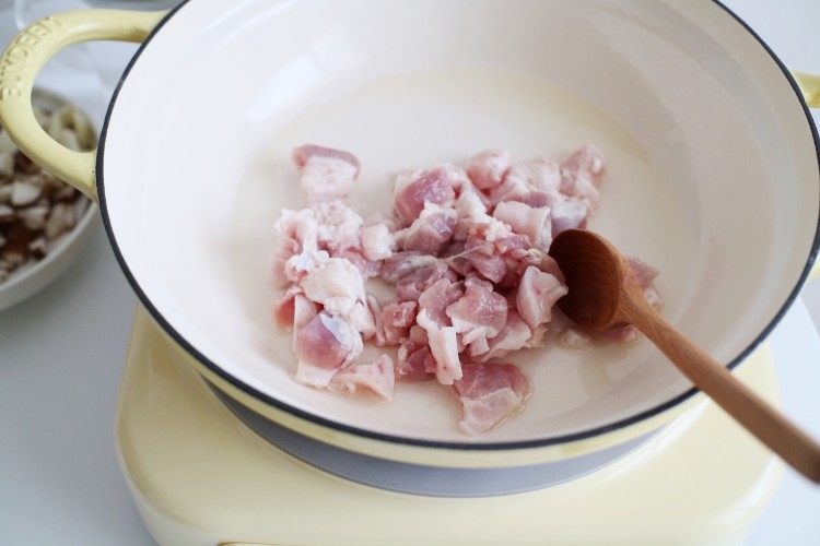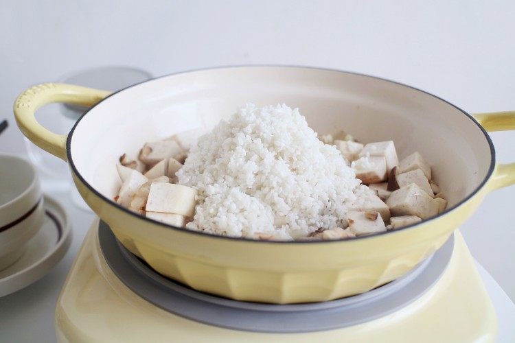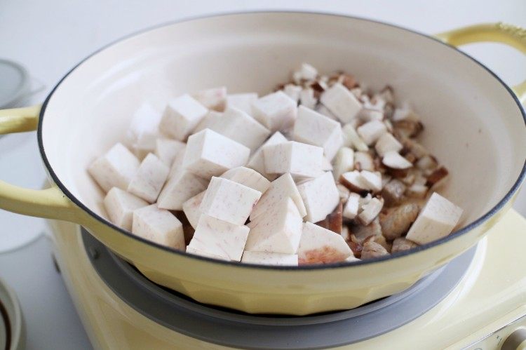 把所有食材准备好,五花肉加料酒腌制半个小时,芋头削皮切丁,香菇切丁,生米淘洗干净提前浸泡半个小时