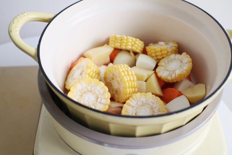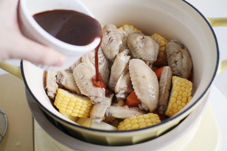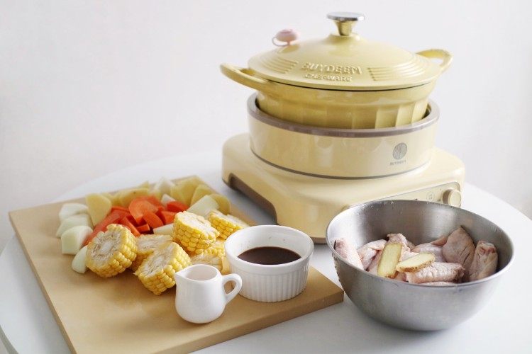 鸡翅清洗干净,两面各划两刀方便入味,土豆胡萝卜削皮切滚块备用,玉米洋葱切块