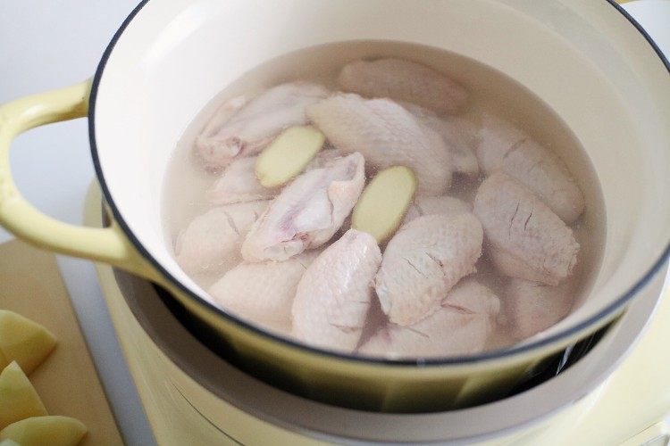 锅里加入没过鸡翅的清水,按下“自由烹饪”功能第四档火力,加姜片料酒煮沸后,把鸡翅捞出备用
