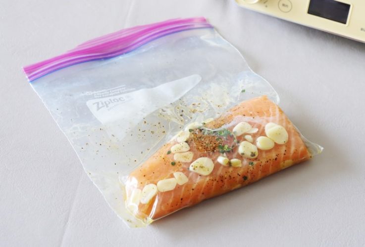 2粒蒜切片。取一只保鲜袋,放入三文鱼,蒜片,2g黑胡椒碎,百里香,橄榄油,料酒,揉捏几下让腌料均匀的覆盖在三文鱼表面,将保鲜袋内的空气尽量排出后封口,腌制15分钟。