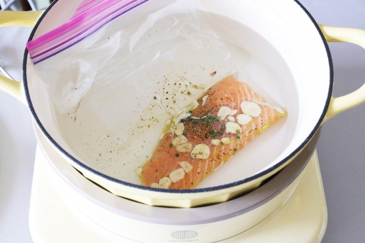 北鼎25cm珐琅锅内放入腌好的三文鱼,倒入冷水。水量要完全没过三文鱼,大约七分满。