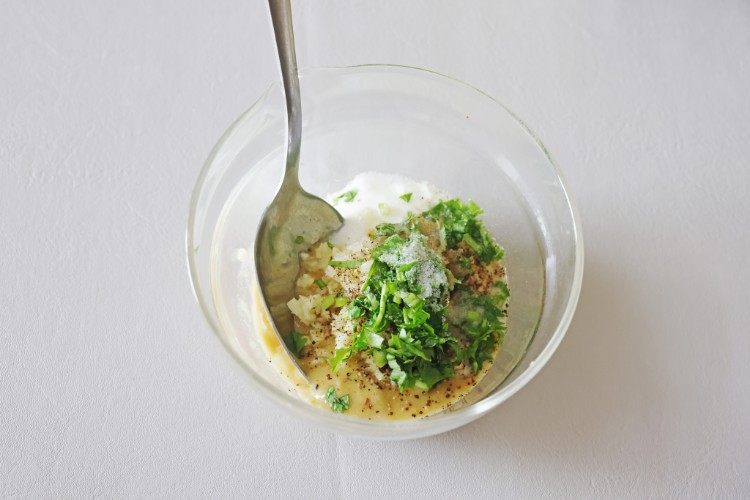 2粒蒜切蒜末,混合希腊酸奶,黄芥末酱,2g黑胡椒碎,盐。香菜切末,取1/3加入酱汁。
