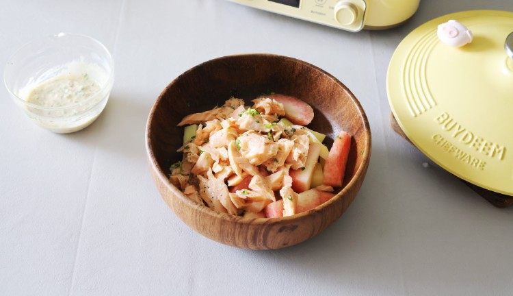 三文鱼煮好后取出,撕成小块,与土豆,桃子块,剩余香菜末一起混合均匀。