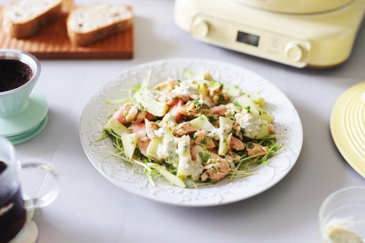 盘中铺上豌豆苗,盛入混合好的三文鱼沙拉,淋上酱汁即可。